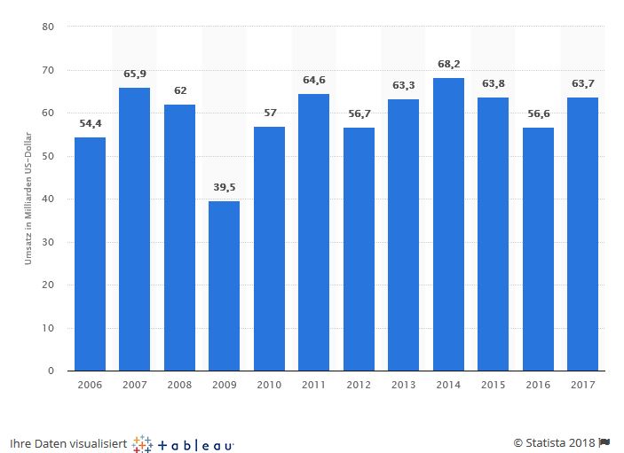 Die Grafik zeigt auch recht eindrucksvoll einen Markt, der sich innerhalb von zehn Jahren kaum bewegt hat. Außer im Jahr 2009, als die Effekte der Finanzmarktkrise auch auf den Kunstmarkt durchschlugen, ist der Markt nicht nur stabil, sondern auch schwankungsarm verlaufen; Honi soit qui mal y pense.