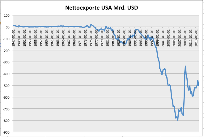Sehen wir auf den Verlauf der Nettoexporte der USA, dann fällt auf, dass ab etwa dem Jahr 1997 diese Kennziffer fast wie ein Stein nach unten fällt. Diese Kennziffer hätte nach ökonomischen "Grundgesetzen" des Kapitalismus andere mit in den Abgrund ziehen müssen. In den Jahren zwischen 2007 und 2017 betrug das US-Handelsbilanzsaldo - bis auf die Jahre 2009-2010, die Zeit der Finanzkrise - stets einen negativen Wert von ca. 800-850 Mrd. US-Dollar; das Land lebt also auf Pump. Amerika kann das, weil es mit dem US-Dollar über die weltweite Referenzwährung verfügt und viele Güter im weltweiten Handel in US-Dollar berechnet werden - wir haben darüber gehandelt.