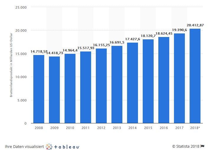 Die Statisti zeigt das Bruttoinlandsprodukt der USA von 2008 bis 2018, also den Gesamtwert aller Waren und Dienstleistungen, die im betreffenden Jahr innerhalb der Landesgrenzen hergestellt wurden und dem Endverbrauch im In- wie im Ausland dienen. Als wichtiger ökonomischer Indikator für die Wirtschaftskraft des Landes, beträgt das BIP der USA geschätzt rund 20,4 Billionen US-Dollar im Jahr 2018.