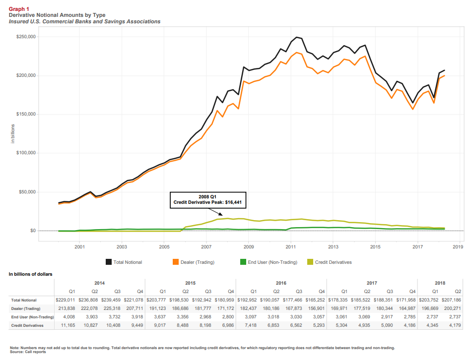 Die Delle im US-Derivaten Handel zwischen 2014-2017 rührt im Wesentlichen daher, dass es zeitweilig Abschreibungsprobleme bei europäischen Investoren gab, die aber die Trump Administration zügig beseitigt hat. Wir konzentrieren uns auf den strukturellen und politischen Aspekt dieses Marktes, dessen Volumen von allein 186 Billionen USD, mithin zu 90% und also überwiegend auf die Top Four der US-Banken fällt.