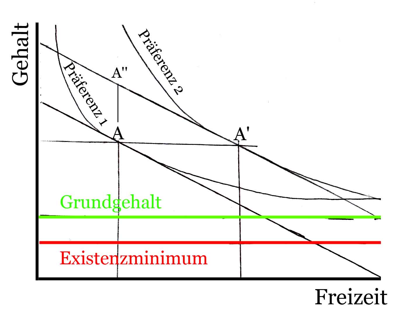 Jede Wahl zwischen A' und A'' ist optimaler als die Wahl von A vor Einführung des Grundgehalts, aber nur eine einzige, nämlich die von A'', erbringt die gleich große Ableistung von Arbeitszeit.